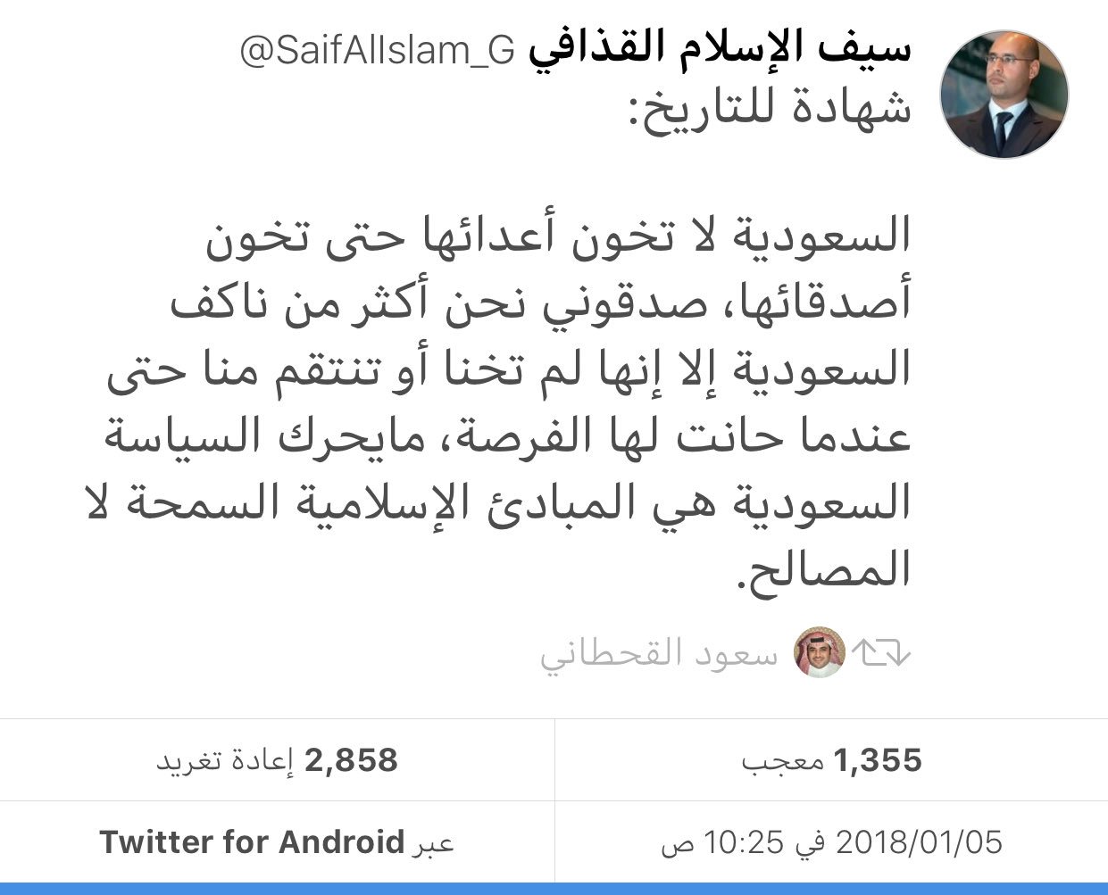 اليمن الآن Pa Twitter سيف الاسلام القذافي شهادة للتاريخ السعودية لا تخون أعدائها حتى تخون أصدقائها صدقوني نحن أكثر من ناكف السعودية إلا إنها لم تخنا أو تنتقم منا حتى عندما حانت